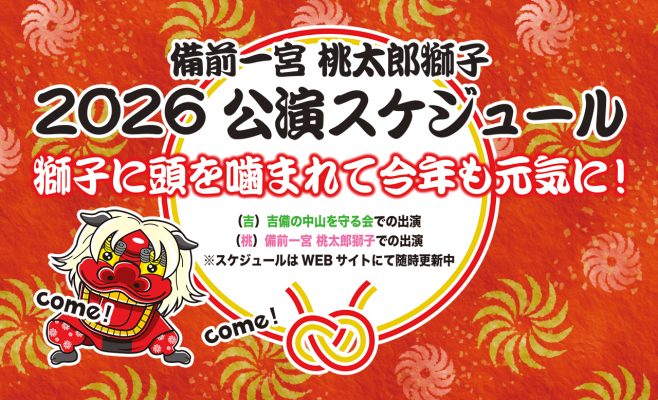 2025年11月30日 / 最終更新日 : 2025年12月25日 info@momotaro-shishi.com 活動履歴 2026 公演スケジュール 【吉】吉備の中山を守る会での出演 【桃】備前一宮 桃太郎獅子での出演 2026年 【桃】12/29(月) RSKラジオ出演 【吉】01/01(木祝) (岡山市)- ※吉備の中山を守る会で出演 【吉】01/02(金) (岡 […]
